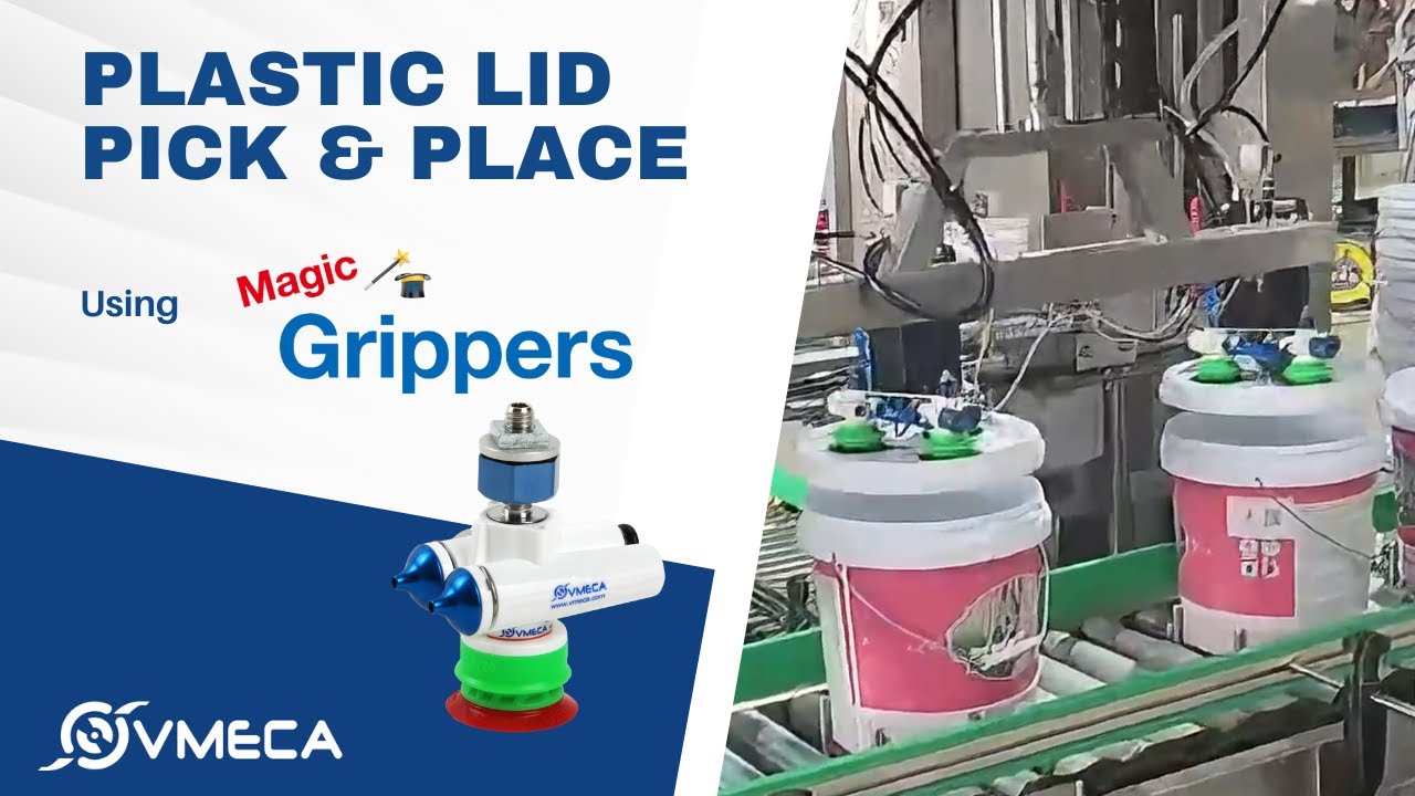 Trong video demo thực tế, Magic Gripper MC10D thể hiện khả năng vượt trội khi xử lý nắp nhựa gallon – một trong những ứng dụng khó nhất trong ngành bao bì: