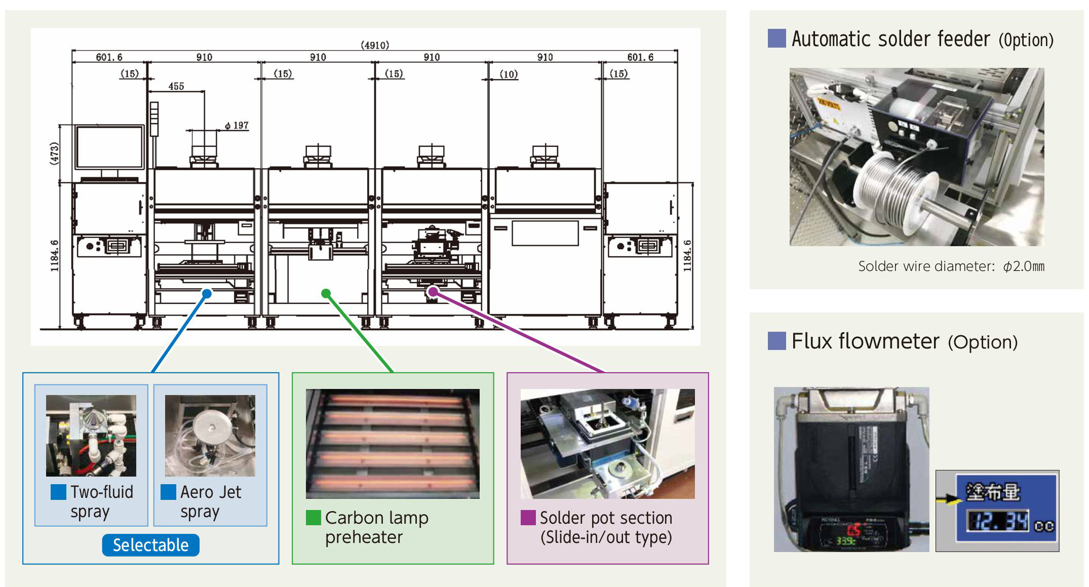 Thiết bị này được thiết kế theo cấu trúc Module Connection Type, cho phép tích hợp linh hoạt các module Fluxer, Preheater và DIP để đáp ứng đa dạng nhu cầu sản xuất.