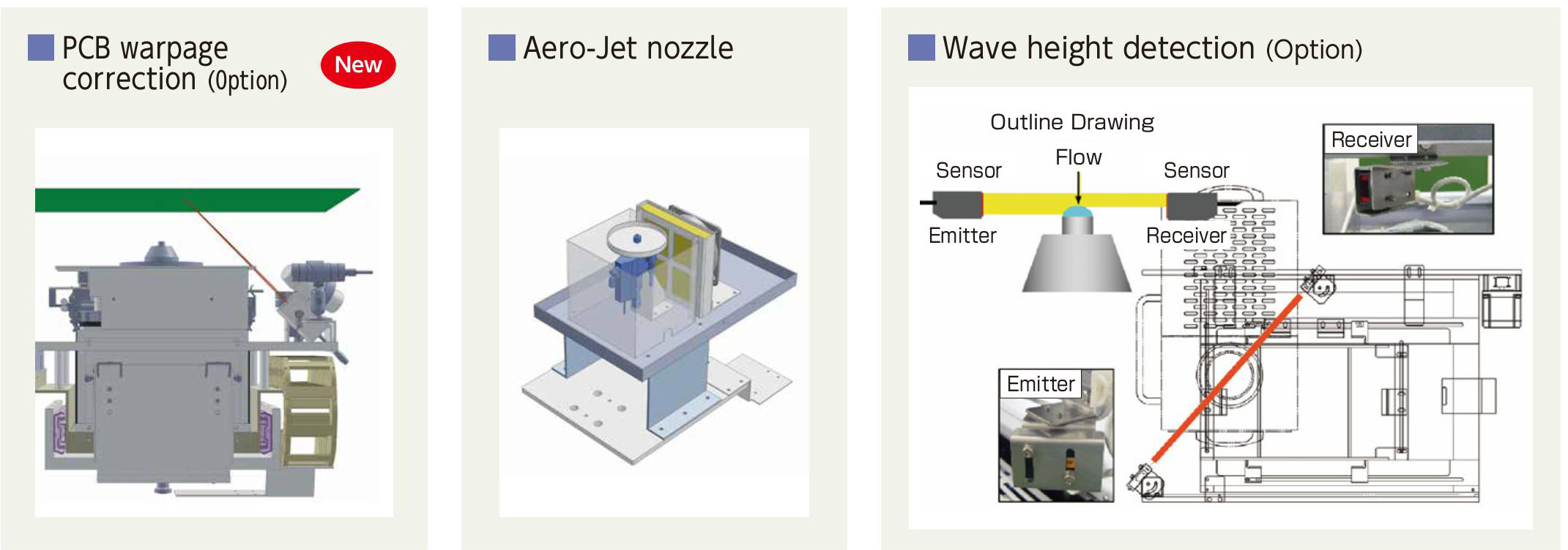 Khách hàng có thể trang bị thêm automatic solder feeder (đường kính dây thiếc ø2.0mm), flux flowmeter để giám sát chính xác, PCB warpage correction để xử lý bo mạch cong vênh, và wave height detection cho kiểm soát chất lượng thời gian thực.