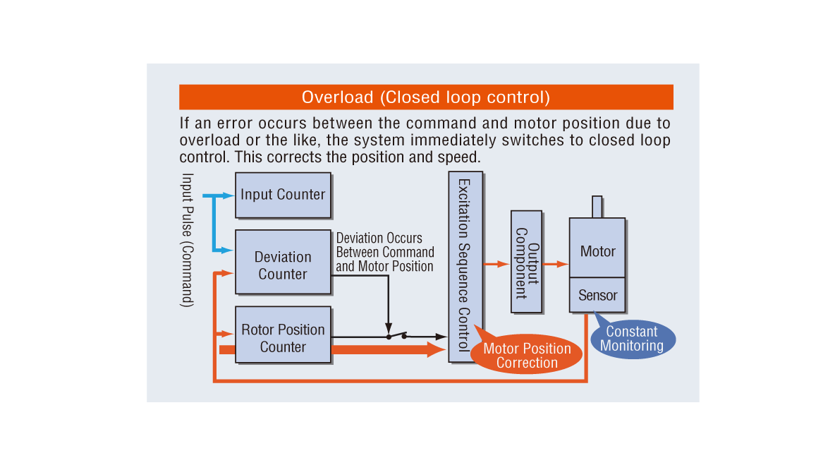 It operates synchronously with commands using open loop control during normal conditions. When overload occurs, it switches immediately to closed loop control to correct the position.