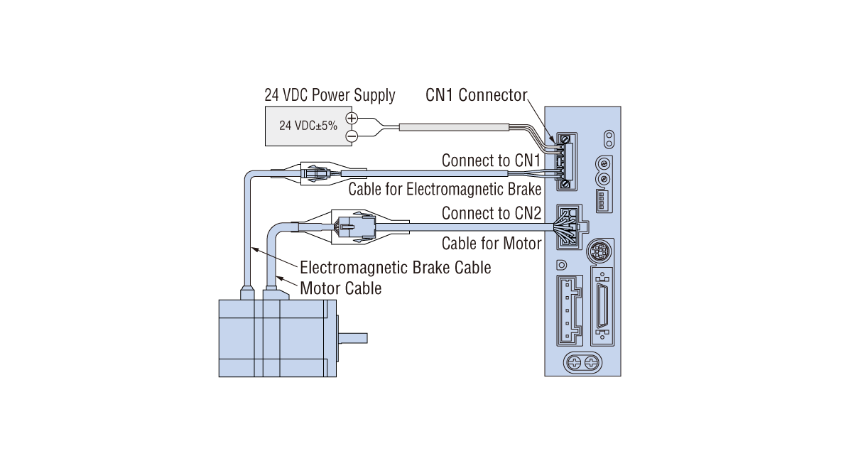 The electromagnetic brake is released when the motor is excited (= the current ON input is turned ON), and activated to hold the load in position when the excitation is cut off (= the current ON input is turned OFF). It is not necessary to provide a separate brake control circuit.