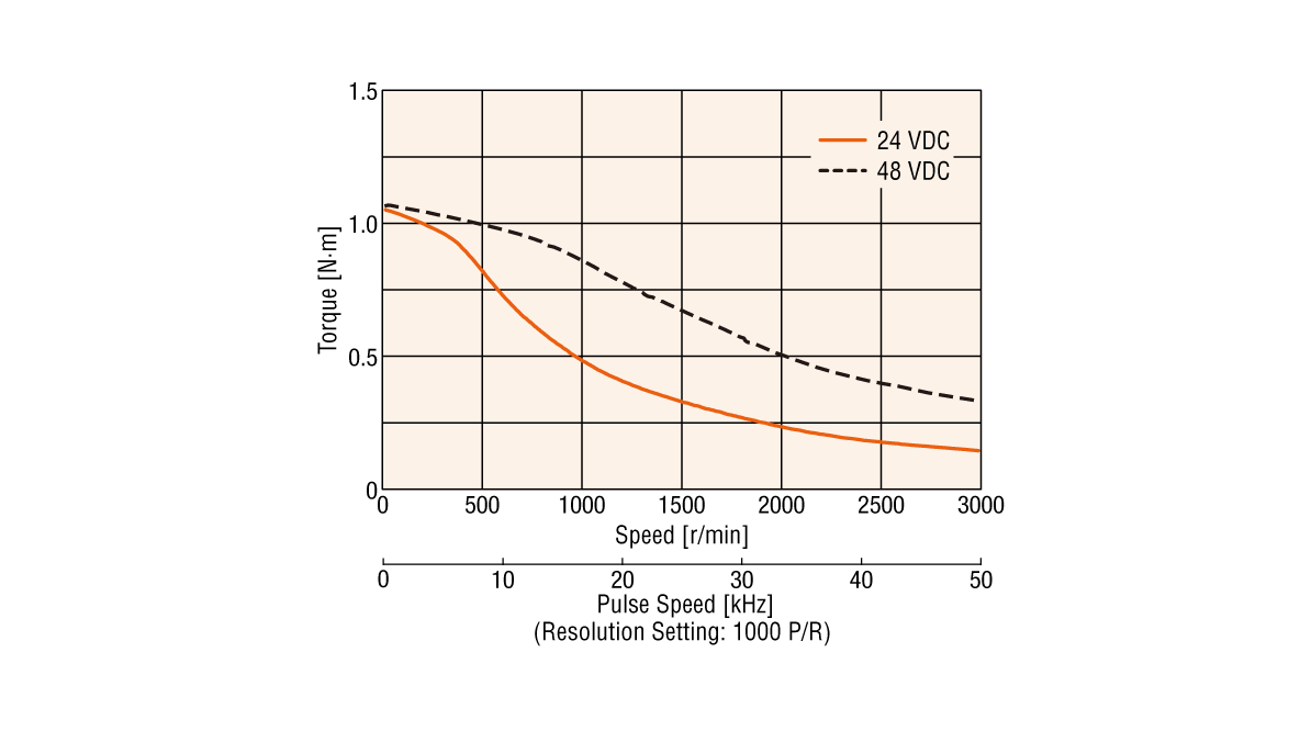 The motor runs on a 24 VDC or 48 VDC power supply. When used with 48 VDC, the torque is increased compared to 24 VDC. (20 mm and 28 mm frame sizes are for 24 VDC input only.)