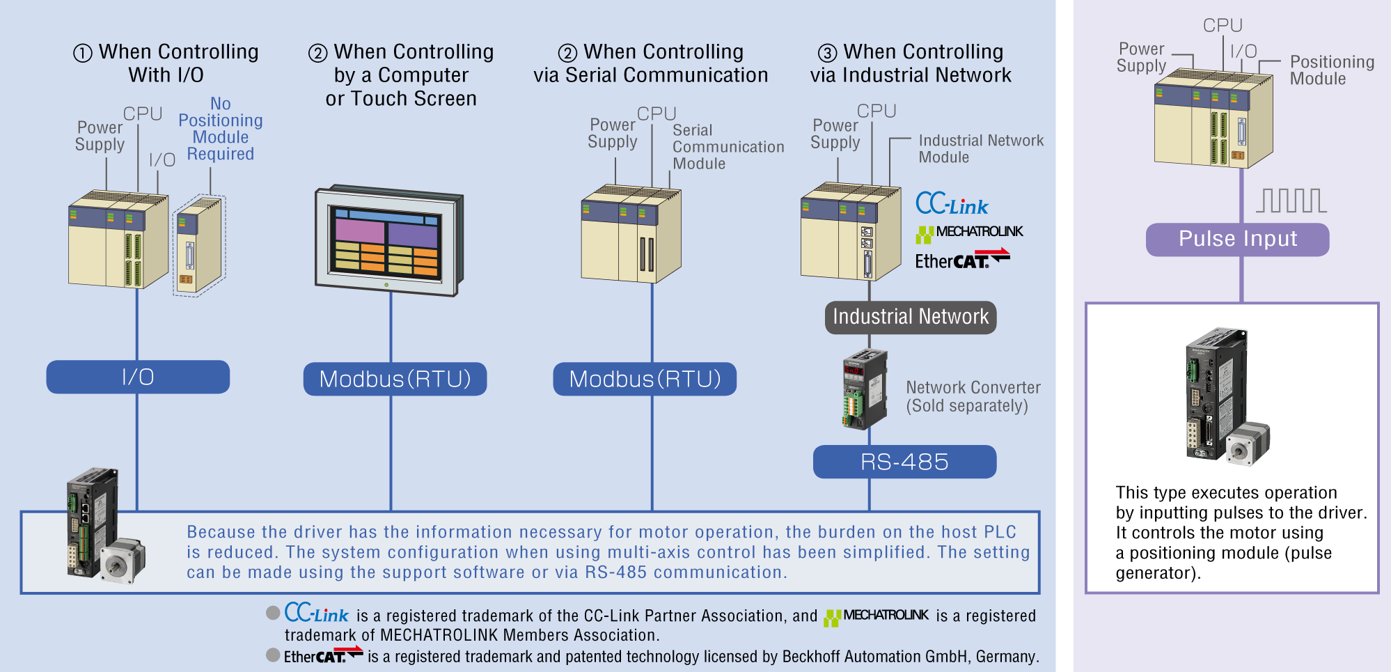 The pulse input type operates by inputting pulse signals from the positioning module (pulse generator) to the driver. Parameter setting and monitoring can be performed using the control module (Sold separately) or MEXE02 support software.