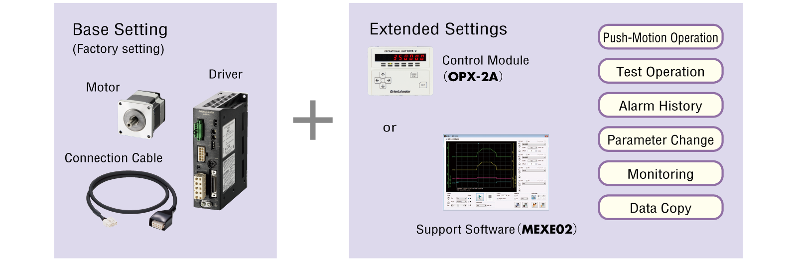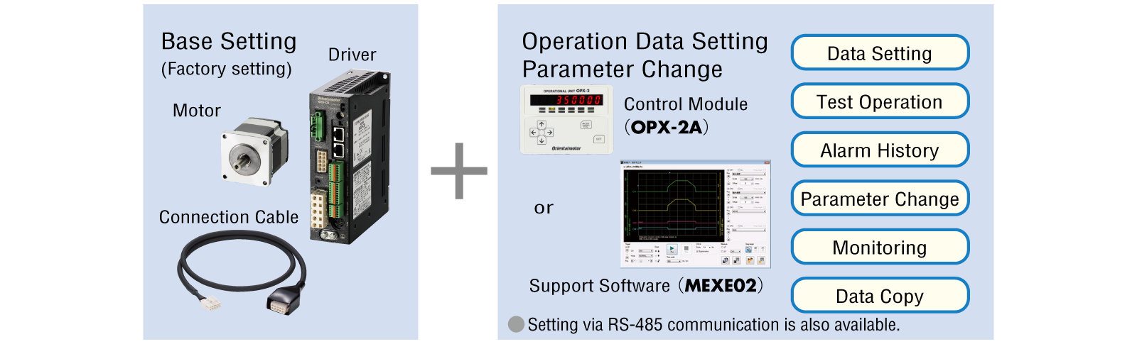 This type reduces the burden on the host PLC by setting the information necessary for motor operation to the driver. The data can be set using either the OPX-2A control module (sold separately), the MEXE02 support software, or RS-485 communication. The system configuration is simple in the case of multi-axis control.