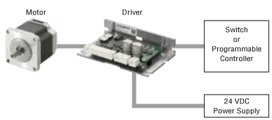 Simple configuration with only motor, driver, and programmable controller. The operating speed, acceleration/deceleration time and operating current are set by driver switches, and the FWD (RVS) input is simply turned ON and OFF. Simple speed control with the performance of a speed control motor is possible.