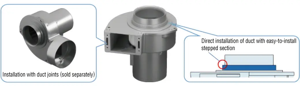 By attaching the mounting brackets for exhaust outlets (sold separately) to the centrifugal blower, it can be mounted from the blower side.