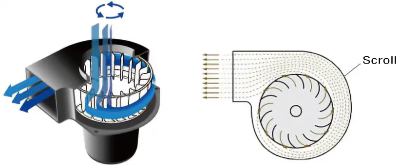 The centrifugal force created by rotating the impeller with a motor generates a swirling flow almost perpendicular to the axis of rotation. The swirling flow is rectified in 1 direction by a casing called a scroll, increasing the pressure. This restricts the exhaust outlet and concentrates the wind to be sent out in a specific direction.