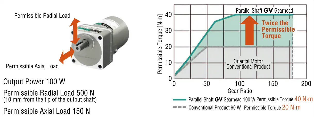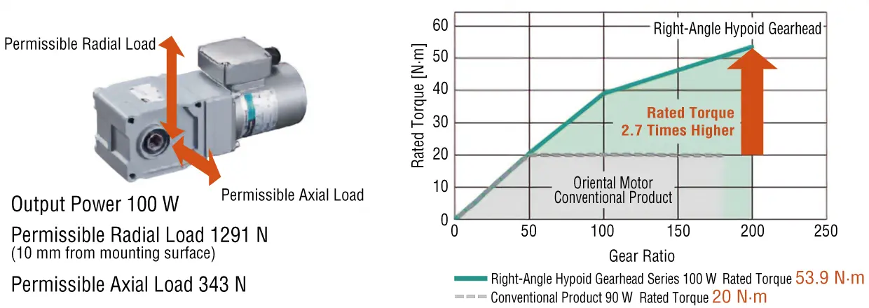 Increased torque is achieved by increasing the size of the output shaft bearing and adopting carburized gears.
