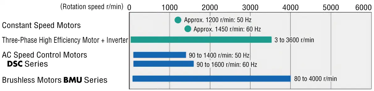 Standard AC motors (constant speed motors) such as induction motors, vary their rotation speed according to the power supply frequency, and the rated speed is approximately 1200 r/min at a frequency of 50 Hz and approximately 1450 r/min at 60 Hz. Speed control motors are available for a wide range of operating speeds from low to high.