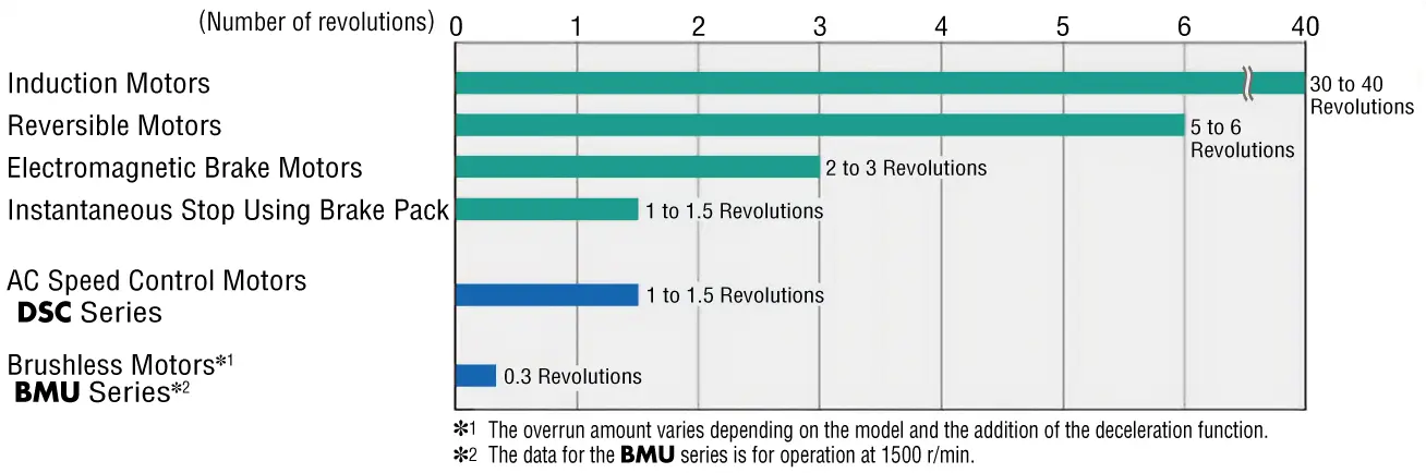 Overrun can be reduced when an electromagnetic brake motor or instantaneous stop function are used.