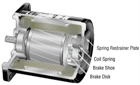 The brake mechanism is constructed as shown in the figure. The coil spring applies constant pressure to allow the brake shoe to slide toward the brake disk.