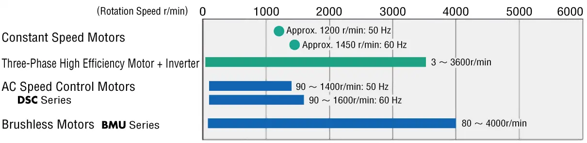 Standard AC motors (constant speed motors) such as induction motors, vary their rotation speed according to the power supply frequency, and the rated speed is approximately 1200 r/min at a frequency of 50 Hz and approximately 1450 r/min at 60 Hz. Speed control motors are available for a wide range of operating speeds from low to high.