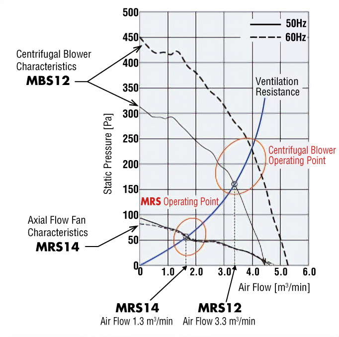 Centrifugal blowers as well as axial flow fans are suitable for allowing air to flow through equipment with large ventilation resistance, such as high-density equipment or narrow vents. The figure below shows a characteristics diagram comparing a centrifugal blower with a maximum air flow equivalent to that of the MRS Series □140 mm.