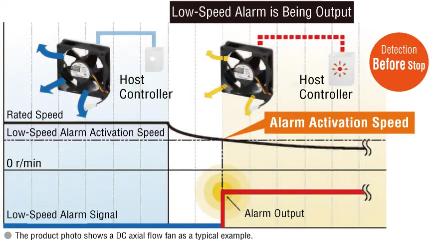 - The alarm output function is activated when the rotation speed drops below 70 % due to unexpected circumstances such as end of service life of the cooling fans or by the ingress of foreign particles, etc.