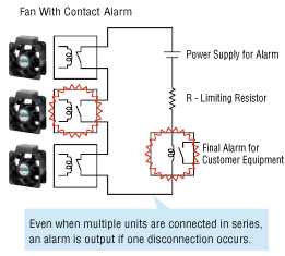 - Contact type fans with low-speed alarms have contact points that turn ON when rotation is normal, and can be connected in series as shown in the figure below.