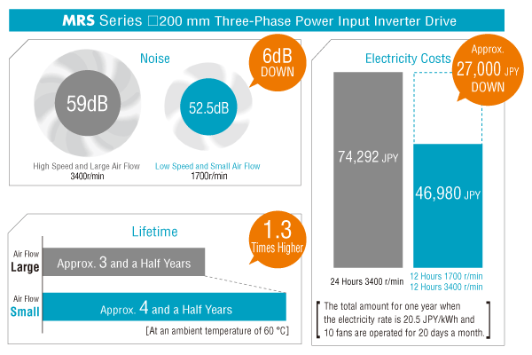 - *Electricity costs are converted at 20 JPY/kWh. When the fans are operating 24 hours a day, 365 days a year