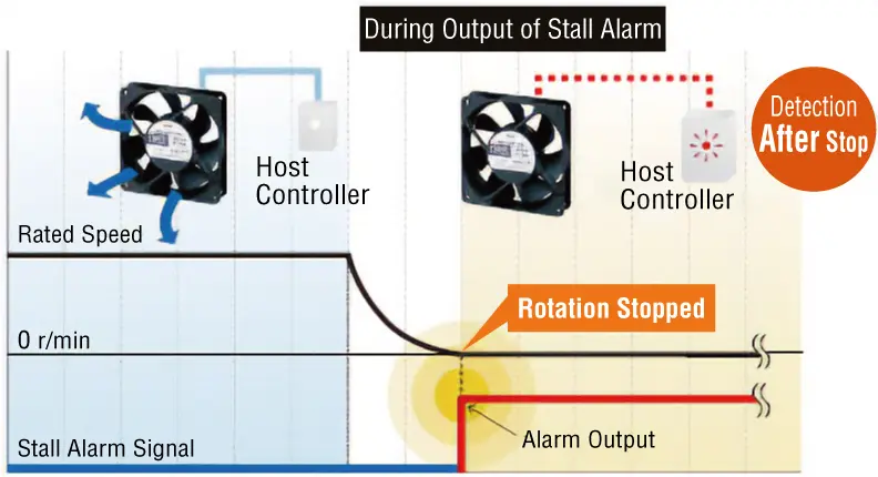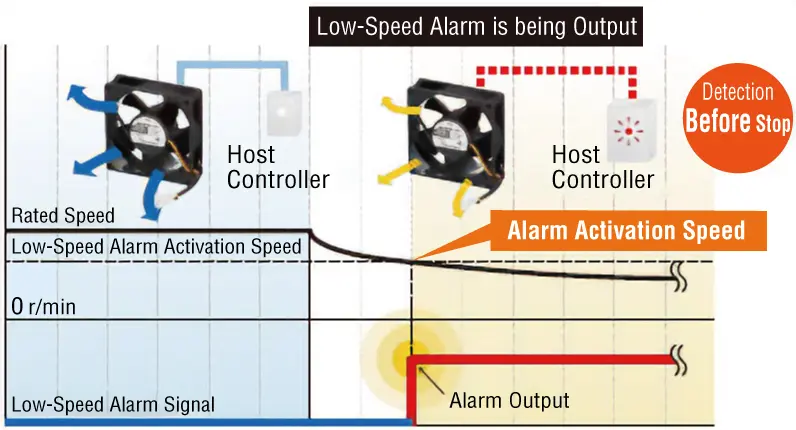 Alarm output from the fan helps prevent equipment issues and failures in the event of an emergency.
