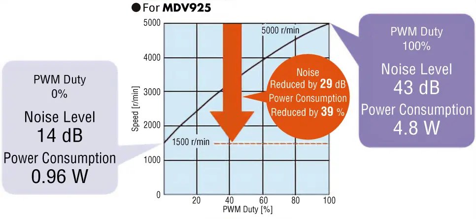 When required, driving the fan at the required air flow achieves a reduction in wasted power and noise.