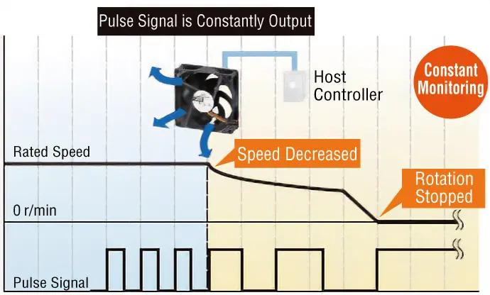 A signal of 2 pulses per revolution is output while the fan is being driven. By checking for changes in pulse signals, the status of the fan can be constantly monitored. Also ideal for equipment that needs to run 24 hours a day.