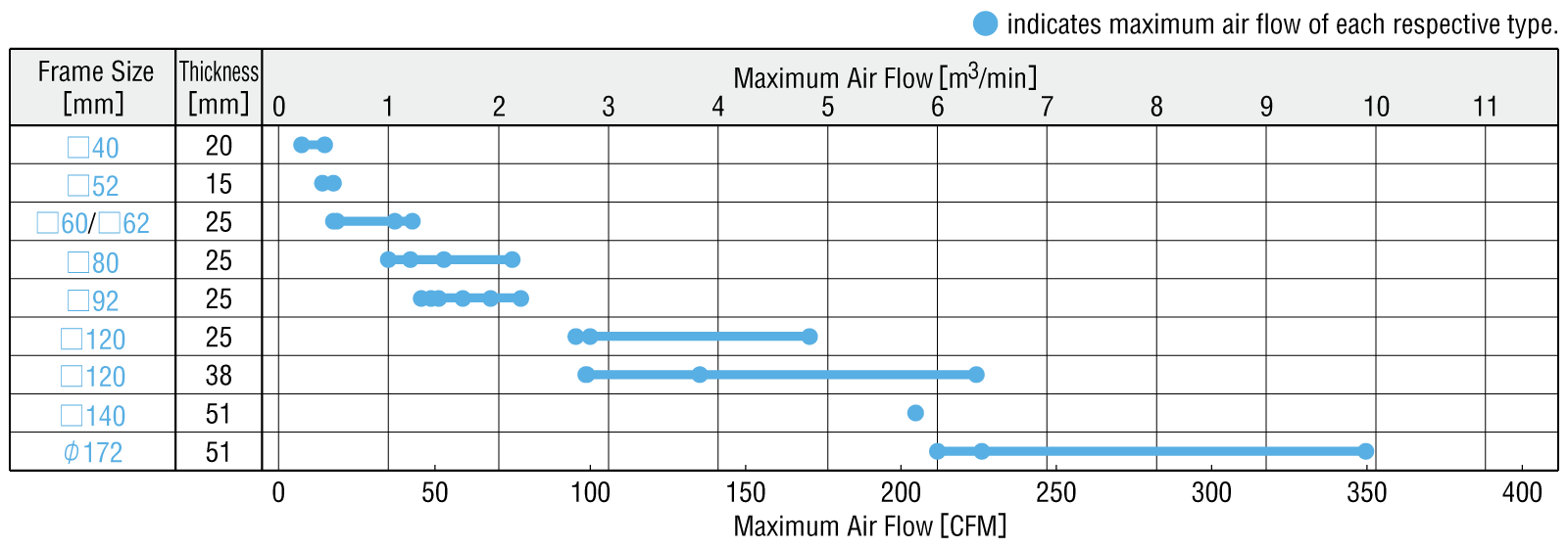 For high-speed specifications, the air flow and static pressure are increased without changing the frame size (S type)
