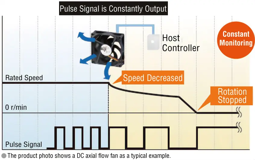 By checking for changes in pulse signals, the status of the fan can be constantly monitored. Also ideal for equipment that needs to run 24 hours a day.