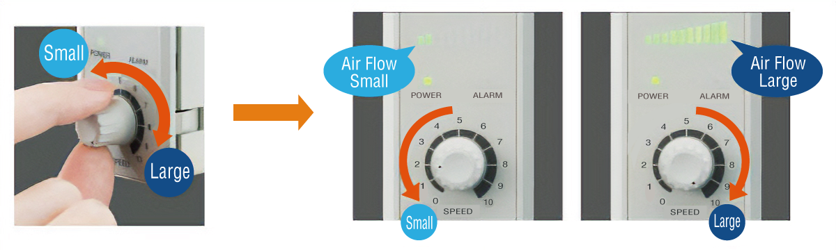The air flow can be easily adjusted by simply turning the setting dial.