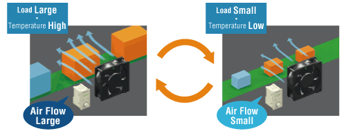 When a fan that adjusts the air flow according to the type of load (size/density) is used to cool the load, it can be connected to an external input such as a sensor to switch the speed, such as full speed (strong wind) for large loads, or low speed (weak wind) for small loads.