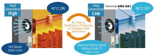 When the fan is used for temperature control in a control cabinet, it can be connected to a temperature sensor such as a thermostat instead of a 2-speed switch, and the speed can be switched between full speed when the heat generated in the cabinet is high and low speed when the temperature is normal.