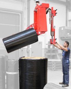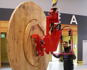 Manipulator Maxipartner MXC column mounted version provided with a portable baseplate, custom-built for lifting reels of insulating material. The base-plate allows an easy and fast use of the Manipulator in more workplaces. The gripping system with interchangeable expanding mandrel allows to lift reels of different sizes, a special device prevents the sliding out of the reel during the inclination phase. The multi-position controls are telescopic and allow the operator to position the reel at great heights. The rotation of the manipulator around the column axis is servo-assisted in case of handling of particularly heavy and cumbersome reels.