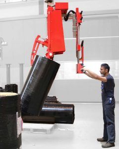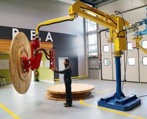 Manipulator Maxipartner MXC column mounted version provided with a portable baseplate, custom-built for lifting reels of insulating material.