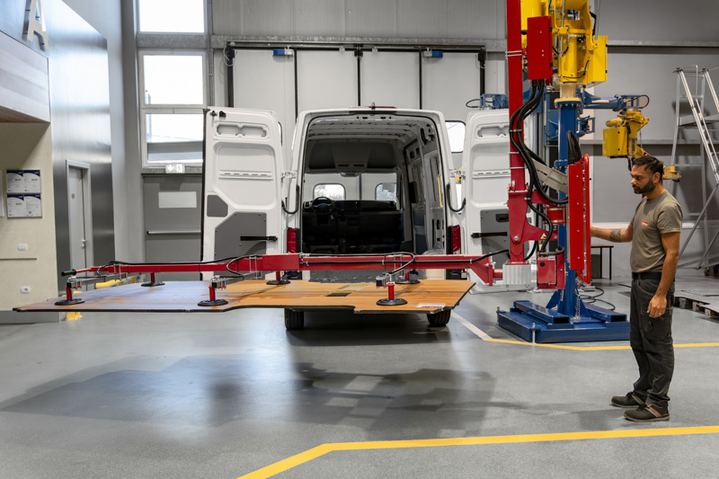 Have a look at our Maxipartner Equo manipulator in action, moving a van floor. We have designed a specially shaped gripping tooling that allows to align, rotate and tilt the floor, so as to insert it into the vehicle with safe and precise movements.