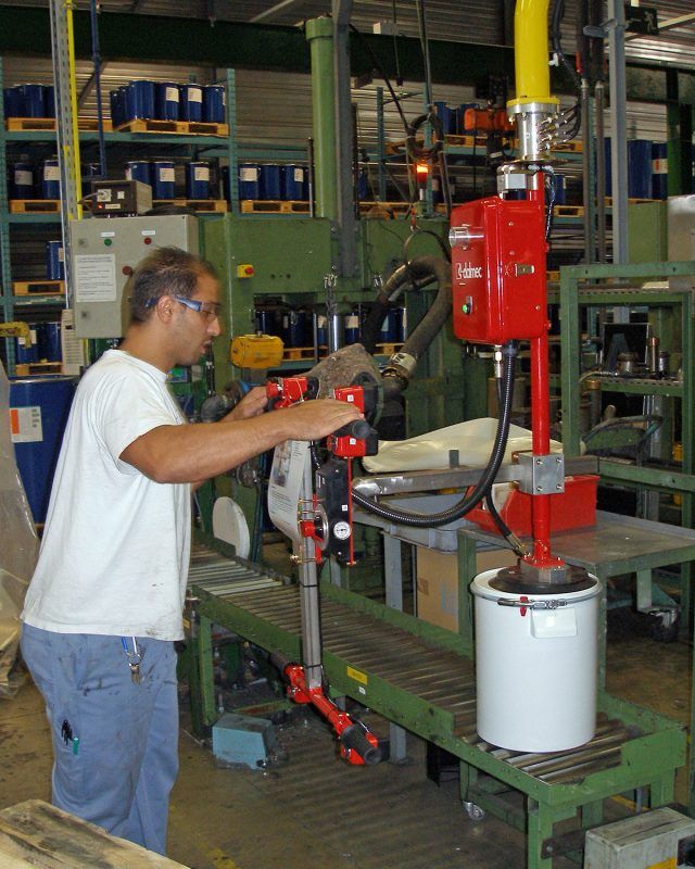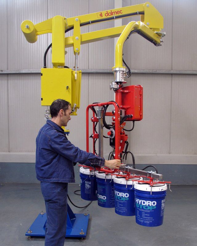 PEC type Partner manipulator, column mounted version, fitted with suction head (Venturi) for gripping and handling pails of different shapes and weights. Interchangeable grippers are available for handling different sizes of pails.