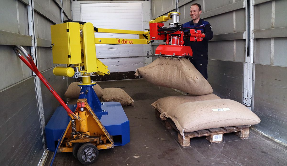 Thanks to Micropartner Manipulator mounted on a portable baseplate for pallet truck, Dalmec can provide solutions for the loading or unloading of various types of goods inside of containers.