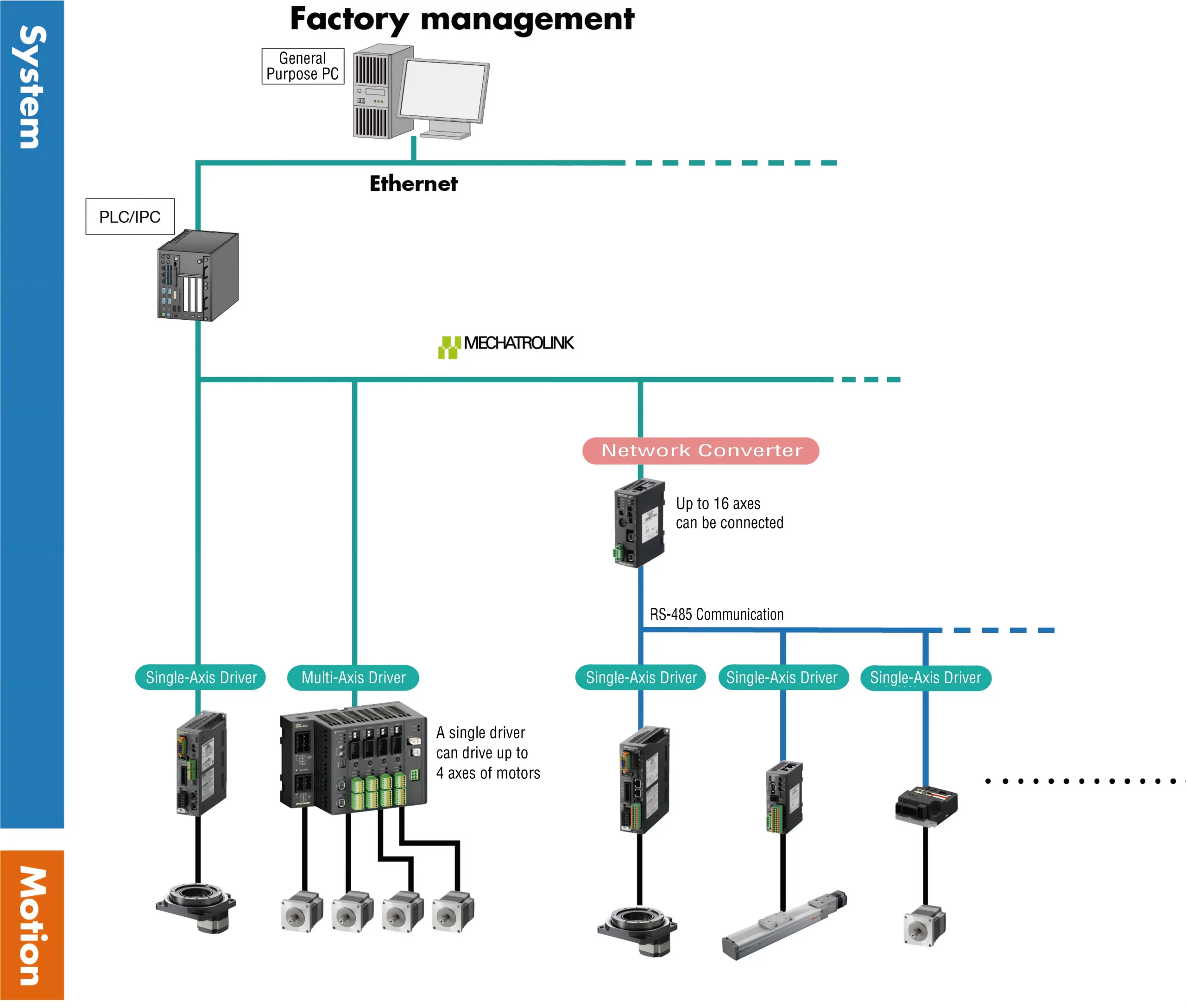 The network converter is a gateway that converts various industrial network communication protocols to Oriental Motor’s own RS-485 communication protocol. Oriental Motor’s RS-485 compatible products can be controlled within various industrial network environments.