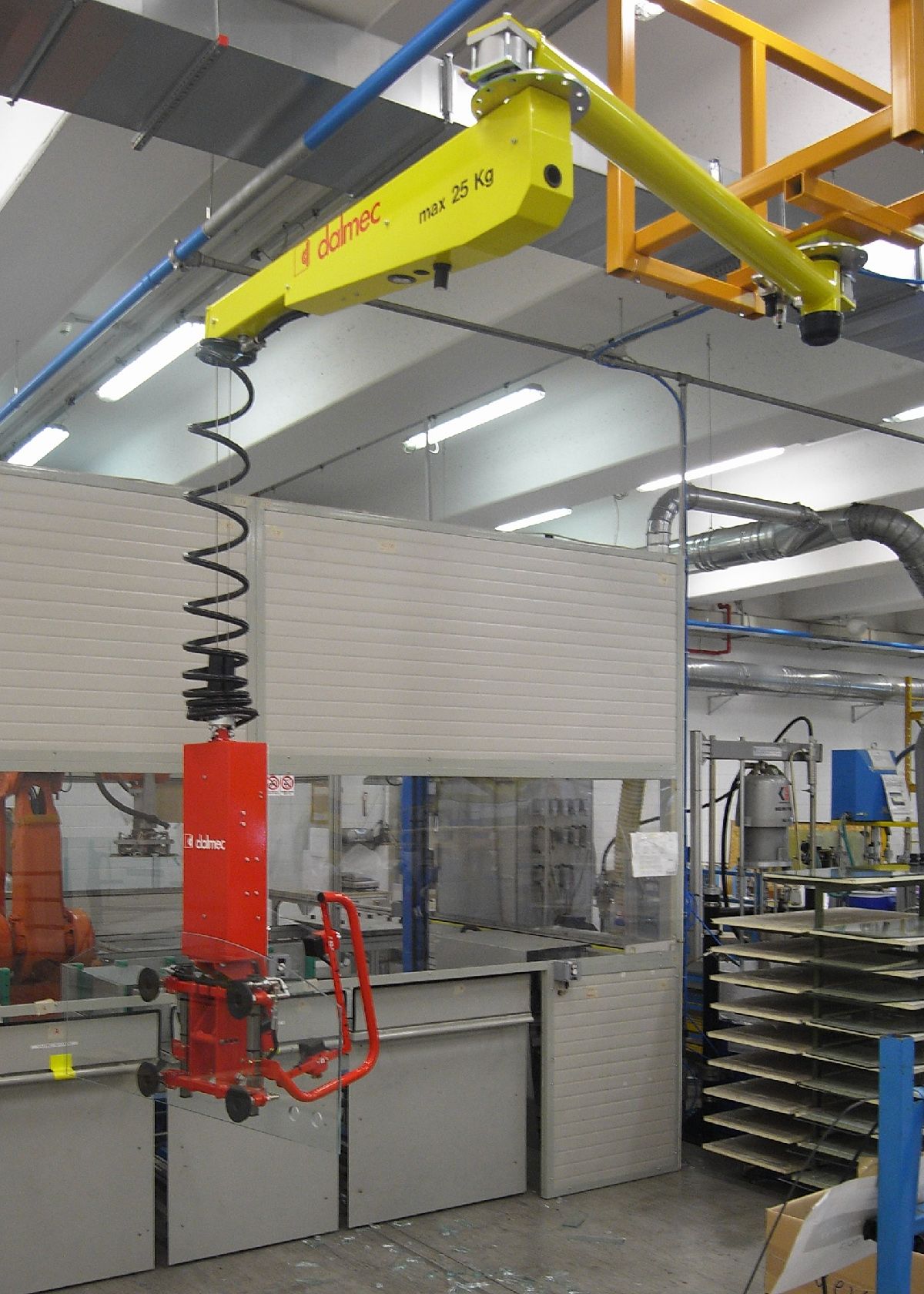 Dalmec gripping system with suction cups combined to the cable balancer Posivel type for lifting and handling of glass panels.?Pneumatic double cable balancer with the particular double arm structure with middle joint makes it smooth and precise throughout the working area.