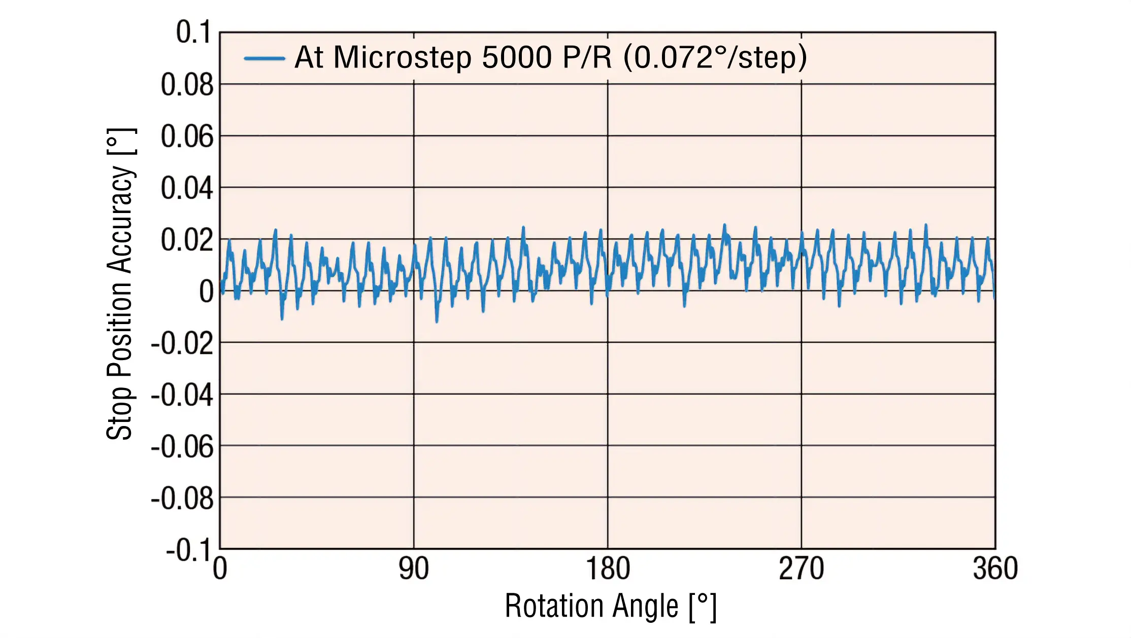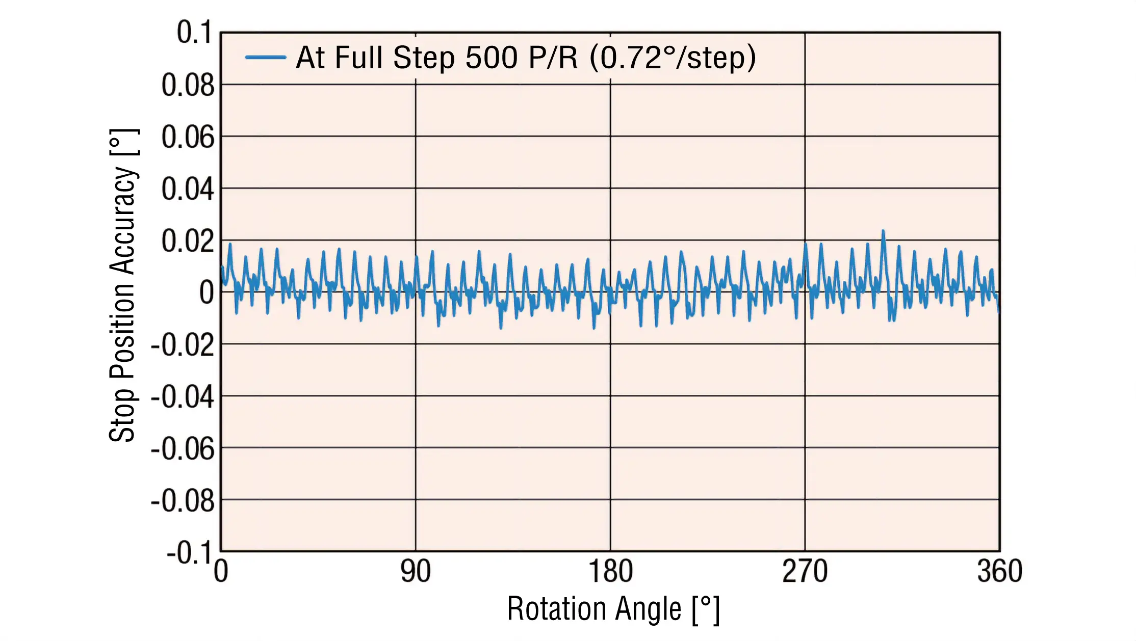 Since the step angle of 5-phase PKP Series is at 0.72˚ (high-resolution type at 0.36˚) and the stopping accuracy is at ±0.05˚, highly accurate positioning is possible. In addition, the stop position accuracy controlled by a microstep driver has almost the same high accuracy as that controlled by a full-step driver.
