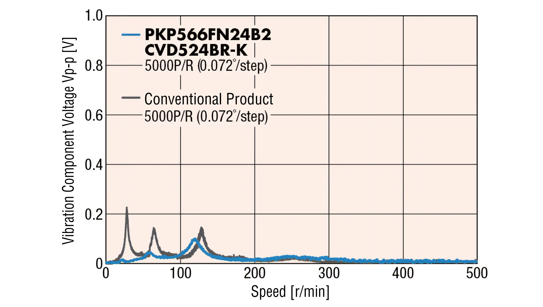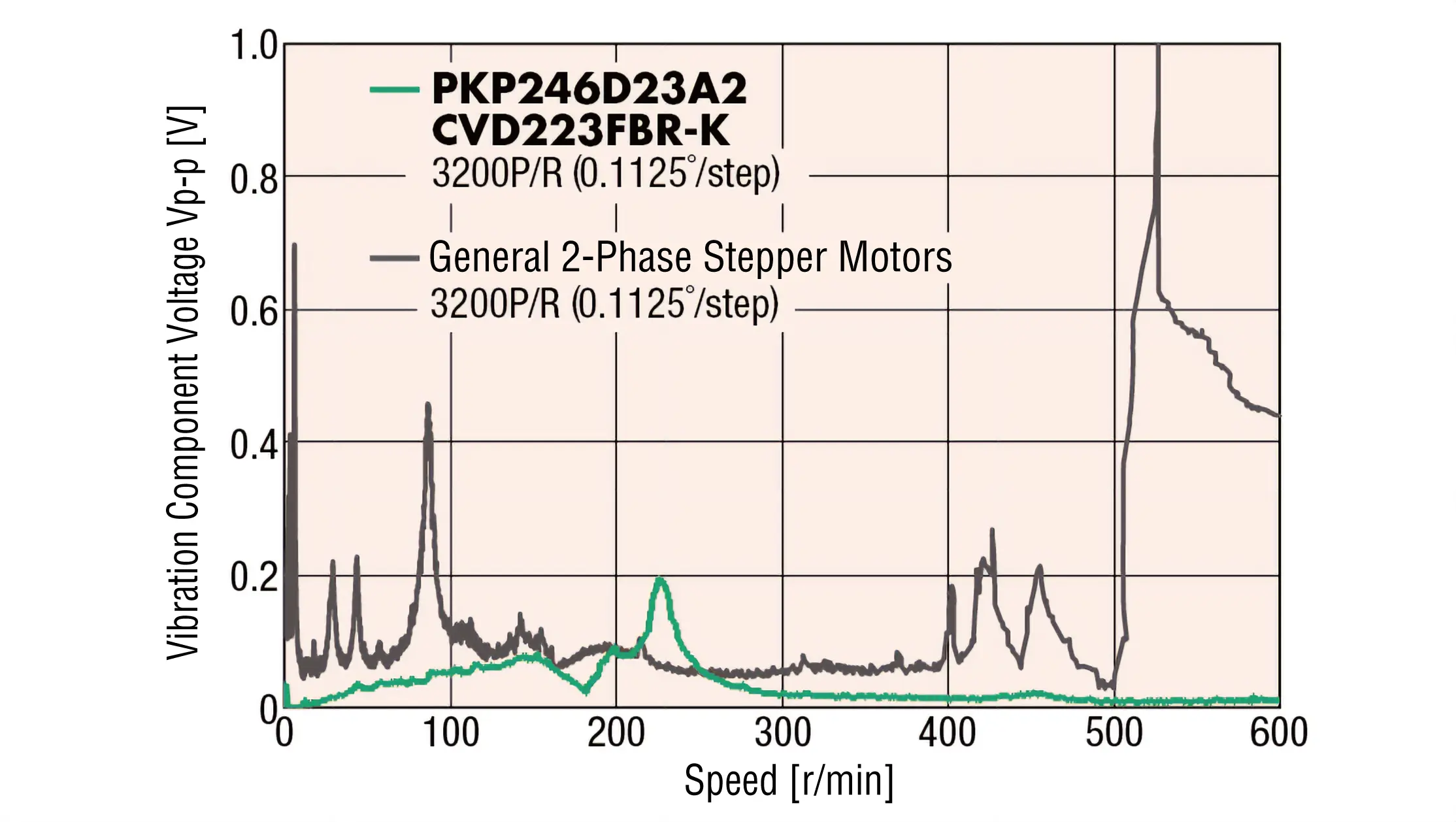 As the 5-phase PKP Series has a small basic step angle of 0.72˚ (0.36˚ for high-resolution type), it is lower in vibration and noise than 2-phase stepper motors with a basic step angle of 1.8˚. Also, vibrations and noise can be further reduced through control with the driver of the microstep drive.