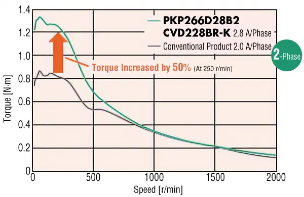 The CVD Series achieves higher torque by increasing the output current compared to conventional products. The design takes into consideration the reduction of heat generation so that the output current can be increased.