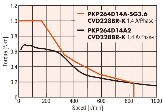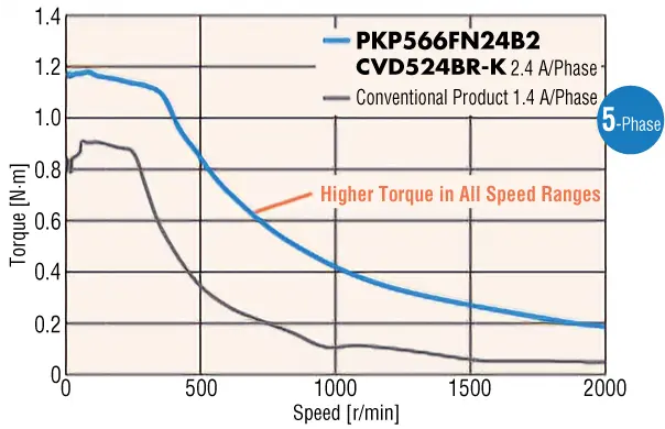 The torque of 2-phase stepper motors in the low speed range and 5-phase stepper motors primarily in the high speed range has been greatly increased. You can select a motor suited to your specifications from a wide range of speeds and torques.