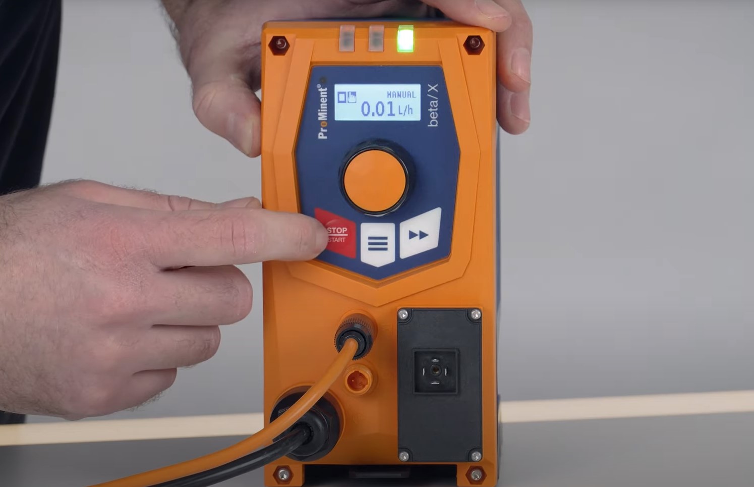 Người vận hành chỉ cần xoay clickwheel để cài đặt lưu lượng, con số hiển thị trực tiếp trên màn hình theo đơn vị l/h hoặc ml/tiếp điểm — không cần tính toán, không cần tra bảng.